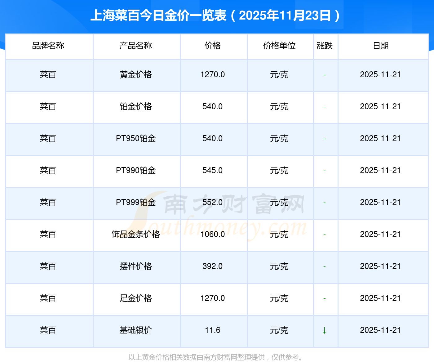 2025年11月23日上海菜百金价查询:黄金价格1305.0元/克,铂金价格616.0元/克,饰品金价(内地)1305.0元/克,黄金饰品(香港)45110.0,铂金价格(香港)17570.0,金条价格(香港)40690.0,金条金价(内地)1143.0元/克,黄金价格1298.0元/克,铂金价格600.0元/克,足金价格1298.0元/克,黄金价格1266.0元/克。