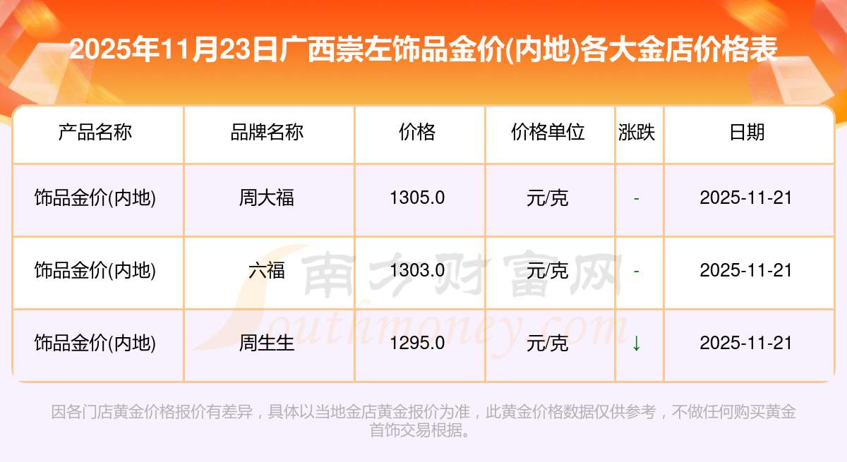 二、2025年11月23日今日广西崇左各金店饰品金价(内地)实时查询表