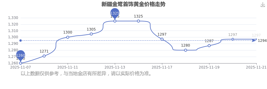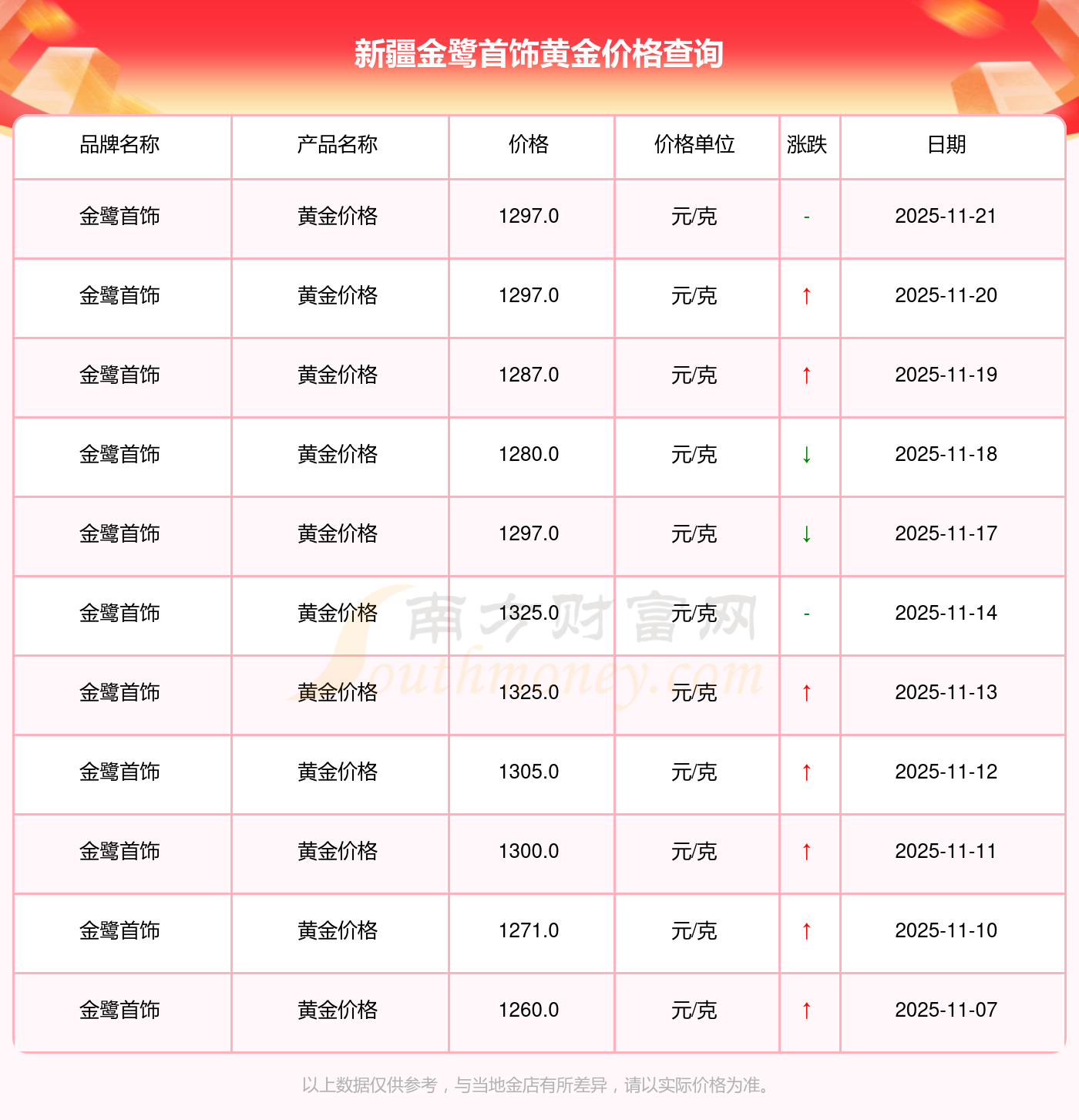 2025年11月23日新疆金鹭首饰黄金价格是1297.0元/克。
