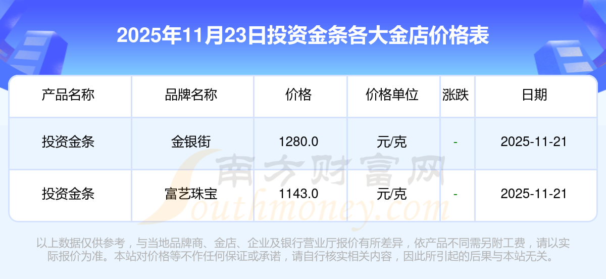 各大金店投资金条最新价格来了,2025年11月23日各大金店投资金条多少钱一克,一起来看看吧!