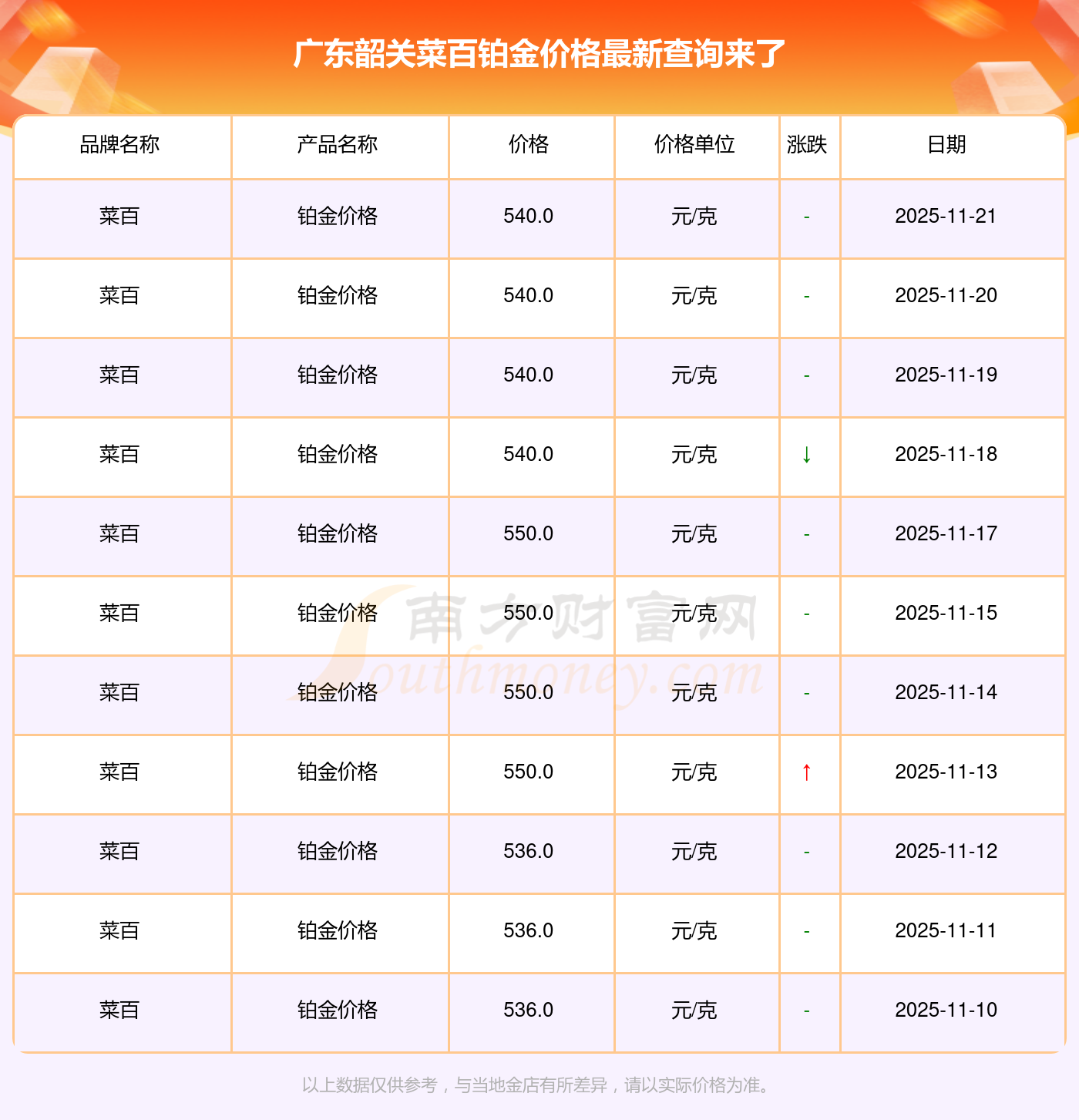 今日(2025年11月23日),540.0元/克是广东韶关菜百铂金价格的价格标准。