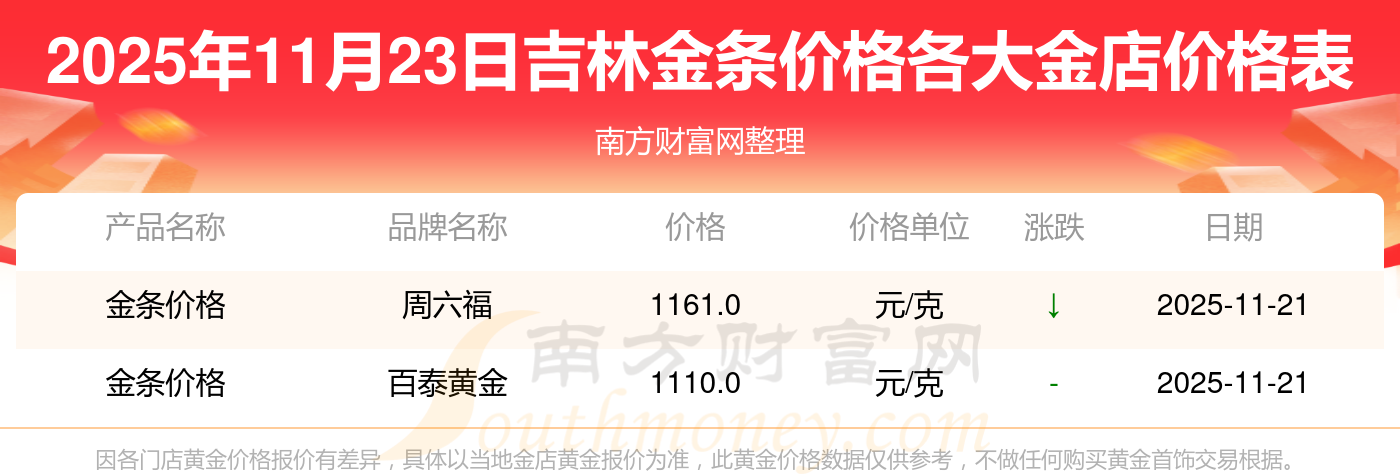 2025年11月23日吉林各大金店金条价格最新价格查询来了:周大福1305.0元/克,周大福616.0元/克,周大福1305.0元/克,周大福45110.0,周大福17570.0,周大福40690.0,周大福1143.0元/克,老凤祥1298.0元/克,老凤祥600.0元/克,老凤祥1298.0元/克,周六福1266.0元/克。