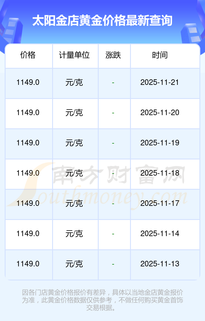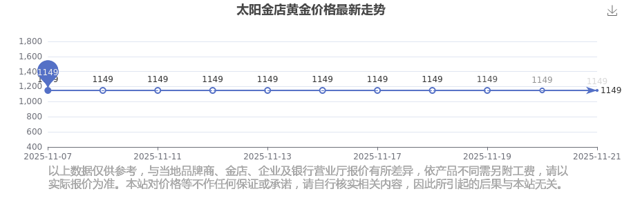 今日黄金价格具体是多少?现在一克黄金卖多少钱?黄金每一克的价格通常在多少数值左右?今日太阳金店黄金价格最新为1149.0元/克。