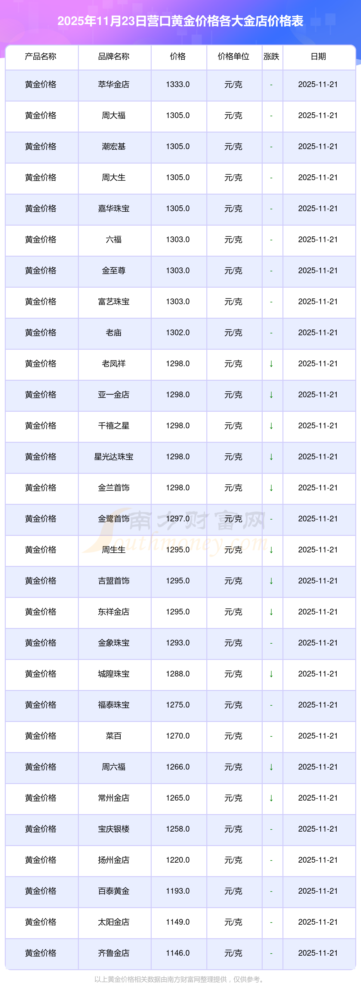 2025年11月23日,营口周大福、周大福、周大福、周大福、周大福、周大福、周大福、老凤祥、老凤祥、老凤祥、周六福等各大金店品牌黄金价格今日价格行情最新来了:周大福1305.0元/克、周大福616.0元/克、周大福1305.0元/克、周大福45110.0、周大福17570.0、周大福40690.0、周大福1143.0元/克、老凤祥1298.0元/克、老凤祥600.0元/克、老凤祥1298.0元/克、周六福1266.0元/克。