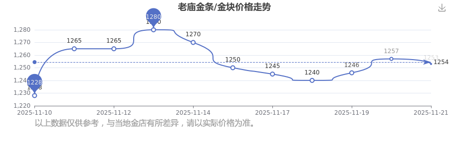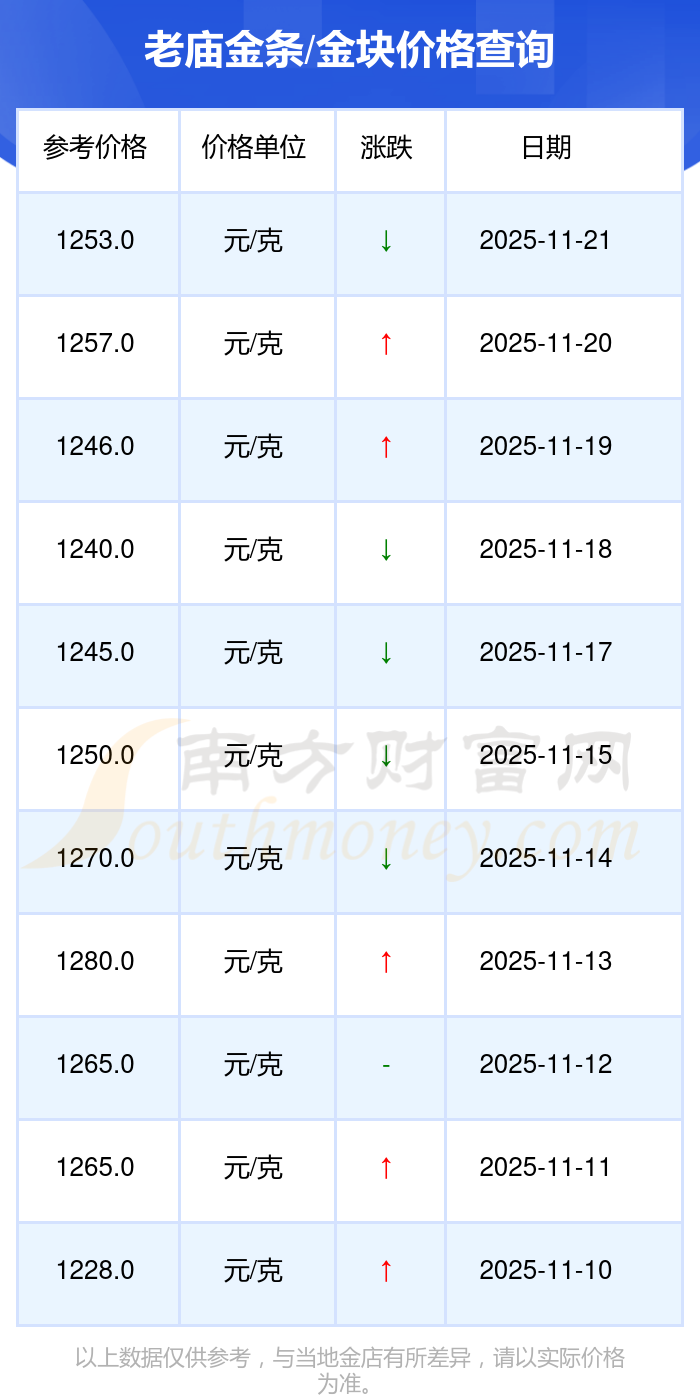今日老庙 金条/金块价格的最新定价为1253.0元/克。