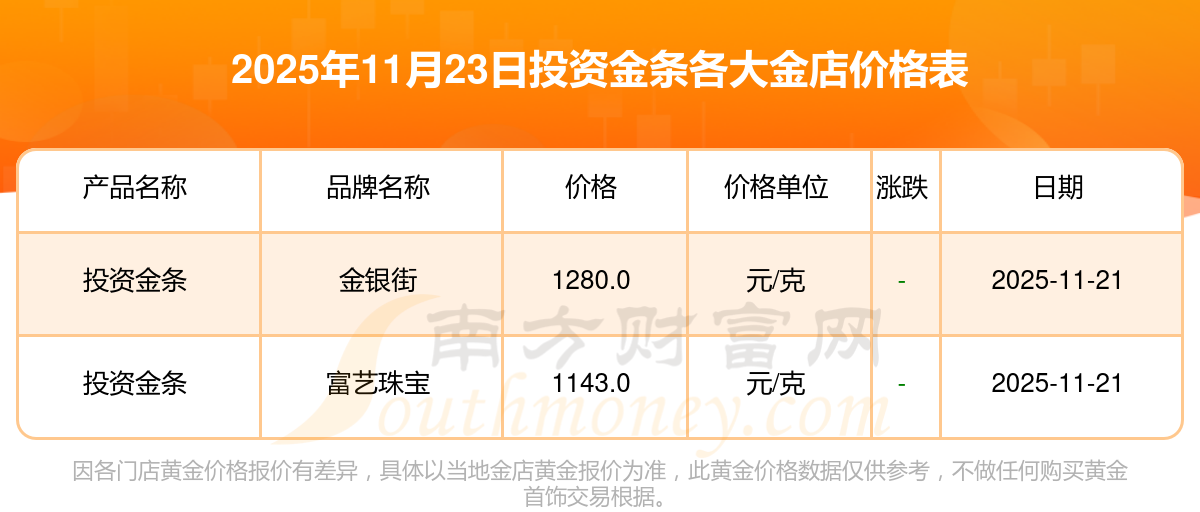 2025年11月23日各大金店投资金条最新价格:周大福1305.0元/克,周大福616.0元/克,周大福1305.0元/克,周大福45110.0,周大福17570.0,周大福40690.0,周大福1143.0元/克,老凤祥1298.0元/克,老凤祥600.0元/克,老凤祥1298.0元/克,周六福1266.0元/克。