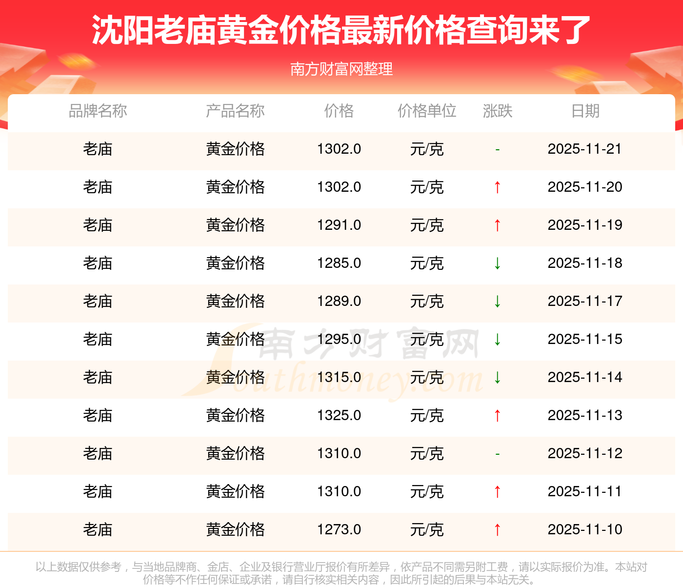 2025年11月23日,今日沈阳老庙黄金价格:1302.0元/克。