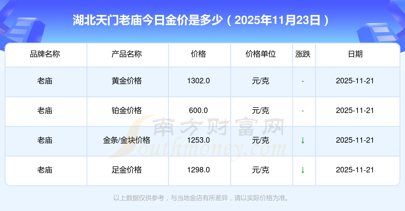 今天黄金价位怎样呢?现在每克黄金卖多少钱?2025年11月23日湖北天门老庙金价查询:黄金价格1305.0元/克,铂金价格616.0元/克,饰品金价(内地)1305.0元/克,黄金饰品(香港)45110.0,铂金价格(香港)17570.0,金条价格(香港)40690.0,金条金价(内地)1143.0元/克,黄金价格1298.0元/克,铂金价格600.0元/克,足金价格1298.0元/克,黄金价格1266.0元/克。