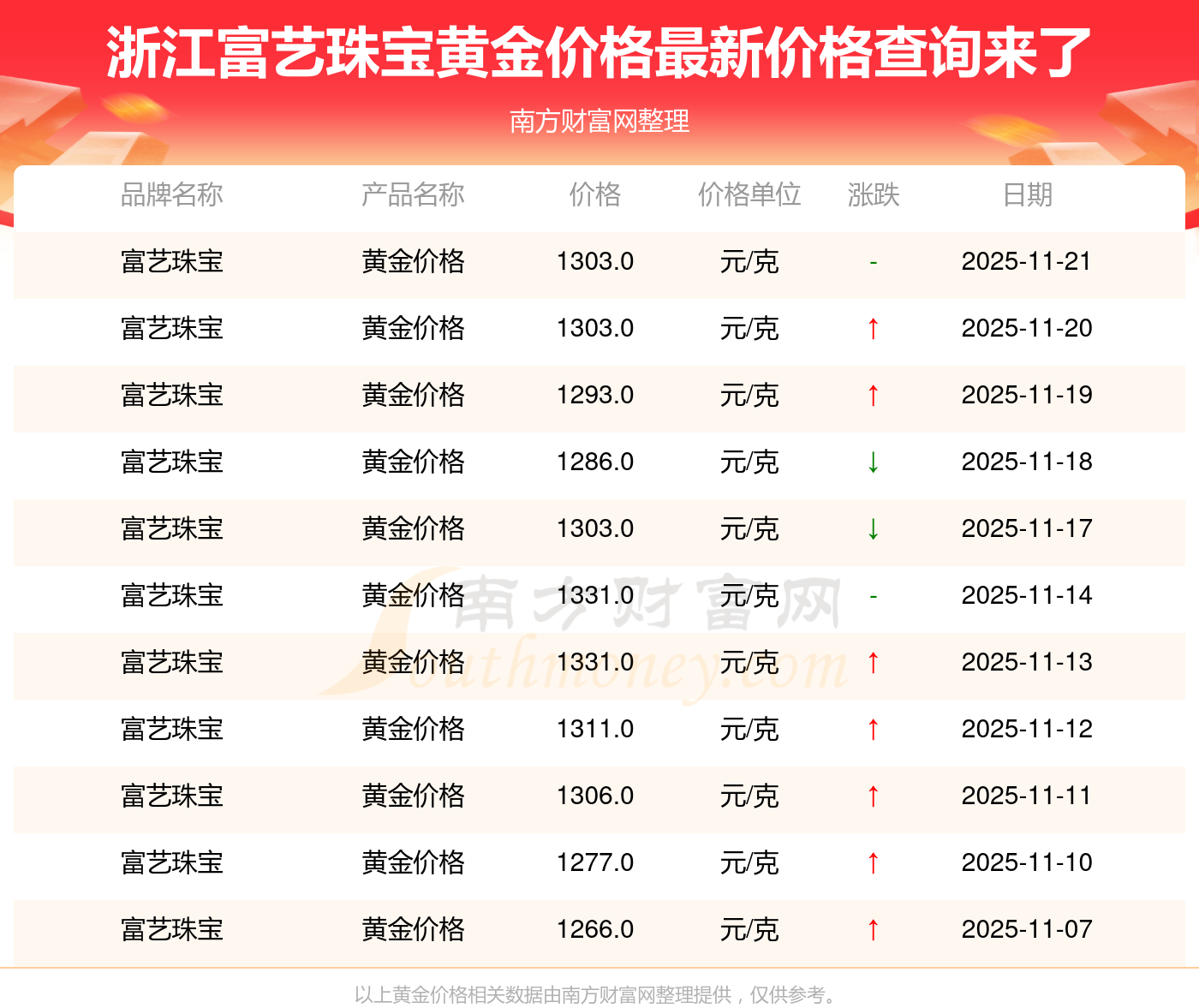 2025年11月23日,浙江富艺珠宝的黄金价格标价达到 1303.0元/克。
