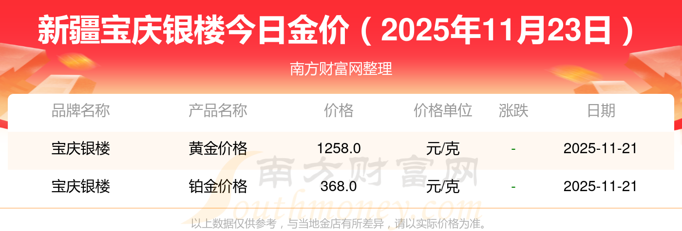 2025年11月23日新疆宝庆银楼金价查询:黄金价格1305.0元/克,铂金价格616.0元/克,饰品金价(内地)1305.0元/克,黄金饰品(香港)45110.0,铂金价格(香港)17570.0,金条价格(香港)40690.0,金条金价(内地)1143.0元/克,黄金价格1298.0元/克,铂金价格600.0元/克,足金价格1298.0元/克,黄金价格1266.0元/克。