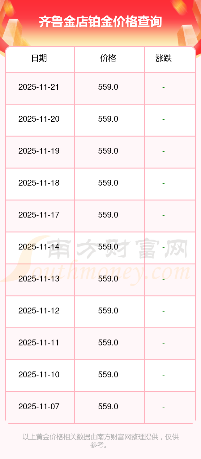 齐鲁金店今日铂金价格的最新市场行情价为559.0元/克。