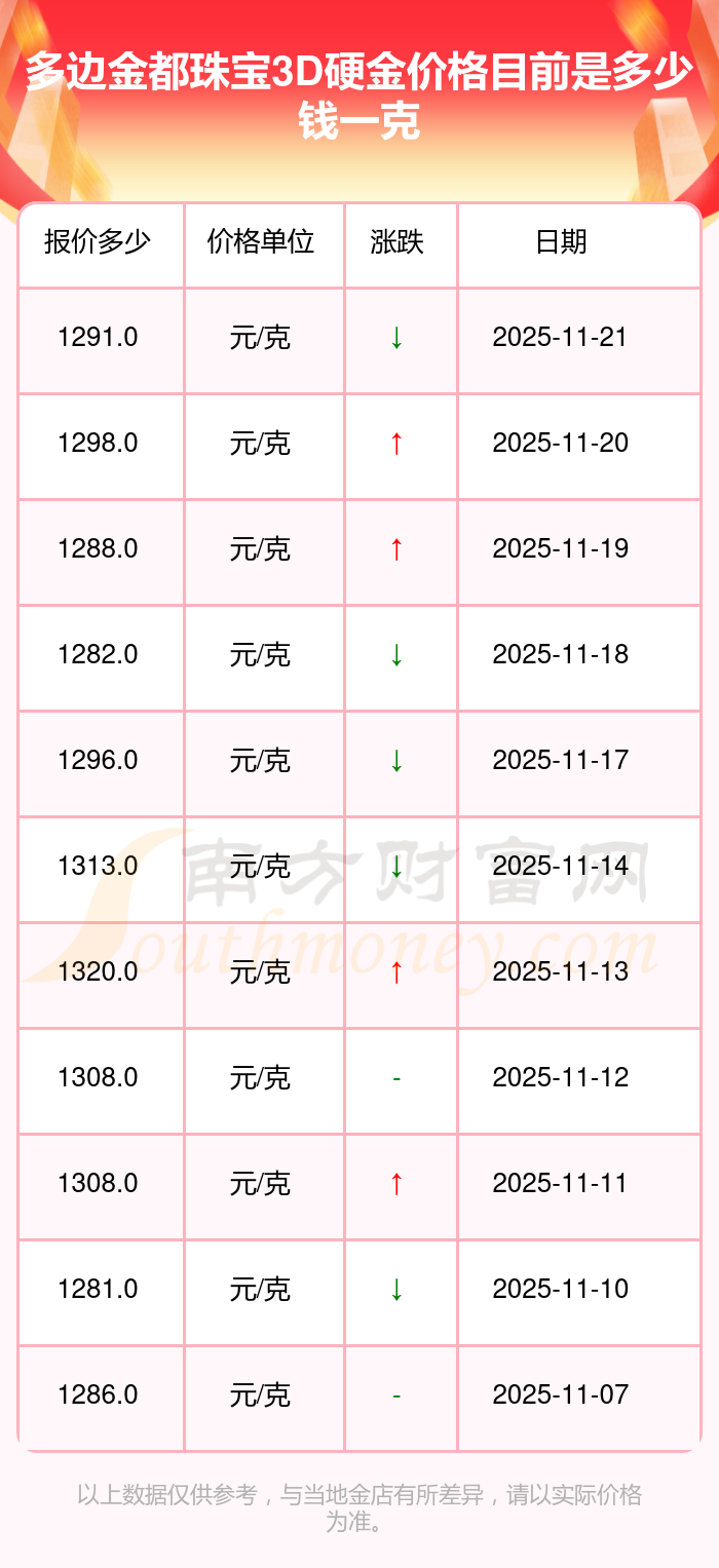 据了解,今日多边金都珠宝 3D硬金的最新价格为1291.0元/克。