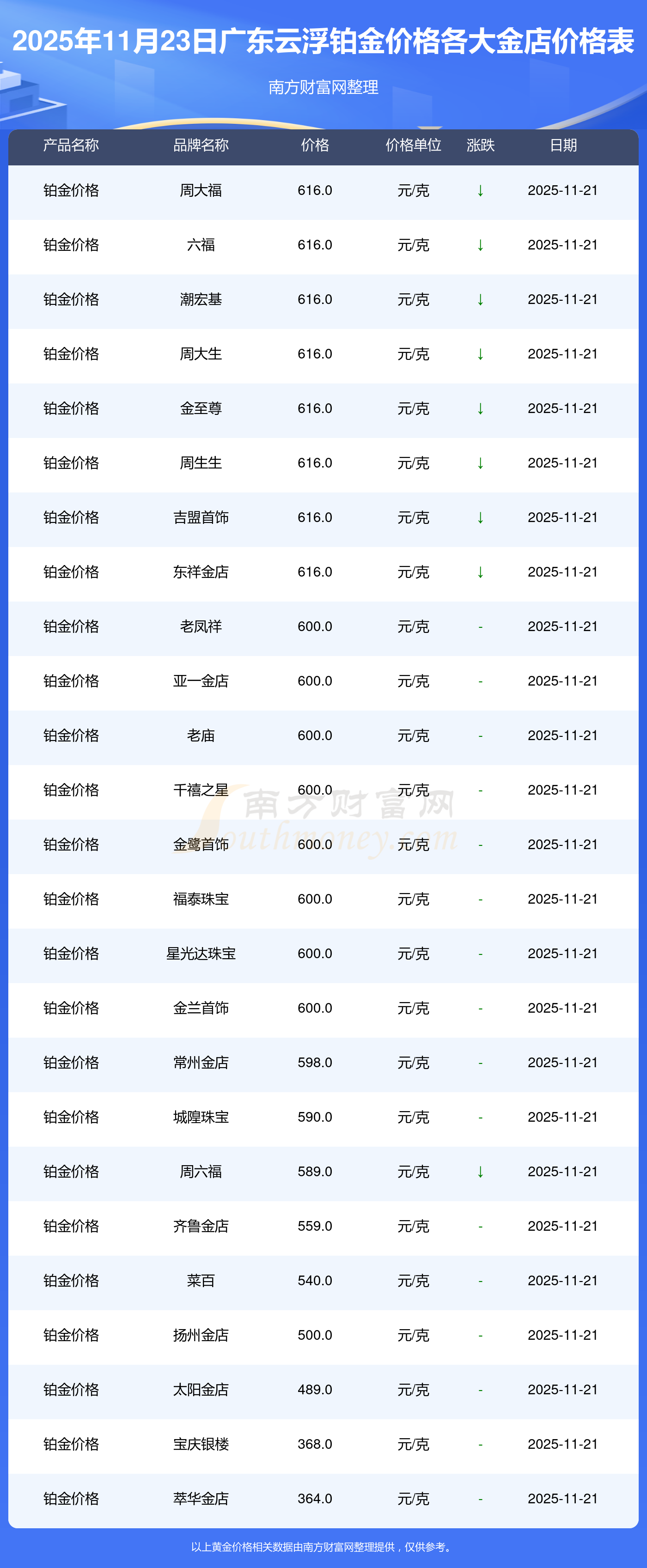 今天是2025年11月23日,广东云浮周大福、周大福、周大福、周大福、周大福、周大福、周大福、老凤祥、老凤祥、老凤祥、周六福等各大金店品牌铂金价格最新价格如下:周大福1305.0元/克、周大福616.0元/克、周大福1305.0元/克、周大福45110.0、周大福17570.0、周大福40690.0、周大福1143.0元/克、老凤祥1298.0元/克、老凤祥600.0元/克、老凤祥1298.0元/克、周六福1266.0元/克。