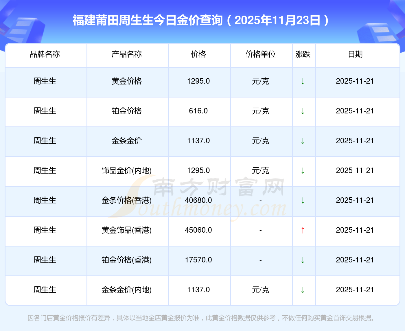 2025年11月23日福建莆田周生生黄金按克计价,现在多少钱一克?黄金价格1305.0元/克,铂金价格616.0元/克,饰品金价(内地)1305.0元/克,黄金饰品(香港)45110.0,铂金价格(香港)17570.0,金条价格(香港)40690.0,金条金价(内地)1143.0元/克,黄金价格1298.0元/克,铂金价格600.0元/克,足金价格1298.0元/克,黄金价格1266.0元/克。