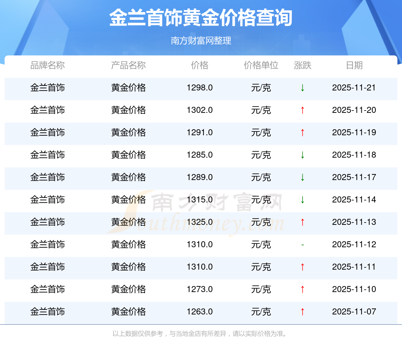 今日黄金价格查询_现在金价黄金一克多少钱,黄金价格是多少钱一克?一般情况下1克黄金的价格会在多少呢?金兰首饰今日黄金价格的最新标价为1298.0元/克。