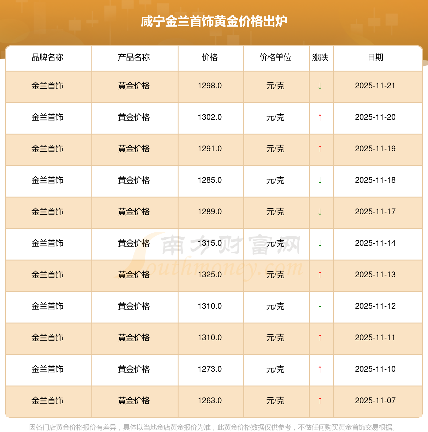 今日(2025年11月23日),咸宁金兰首饰黄金价格的价格是1298.0元/克。