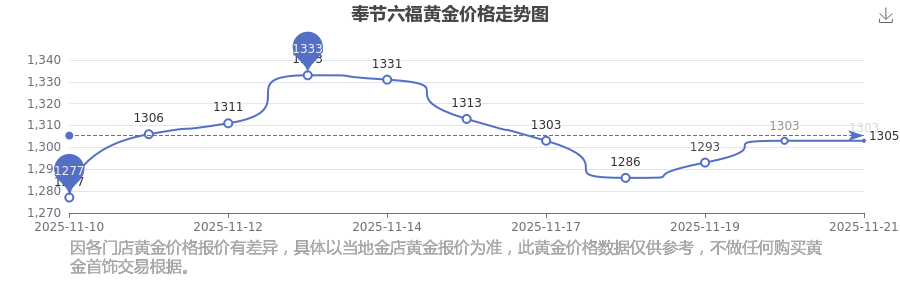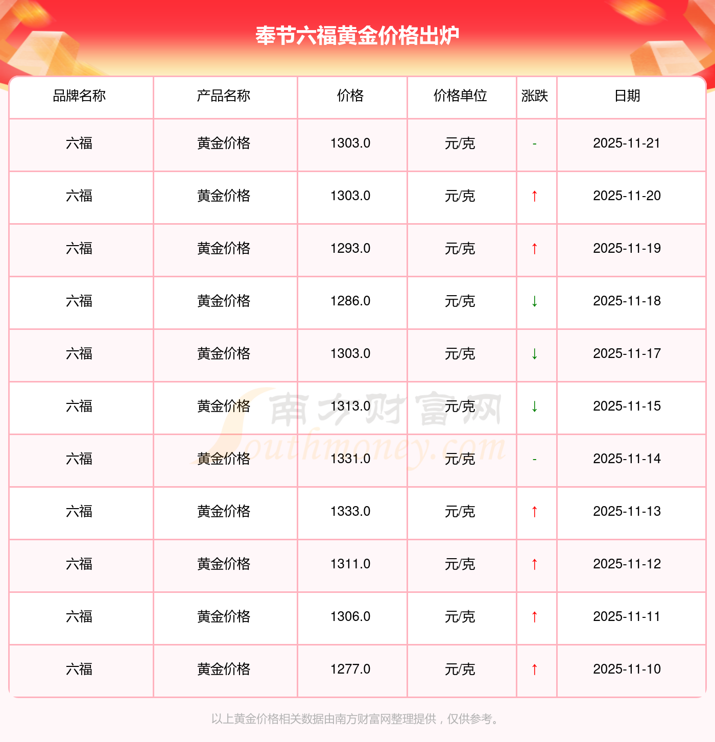 2025年11月23日,奉节六福所售黄金价格,其价格设定为 1303.0元/克。