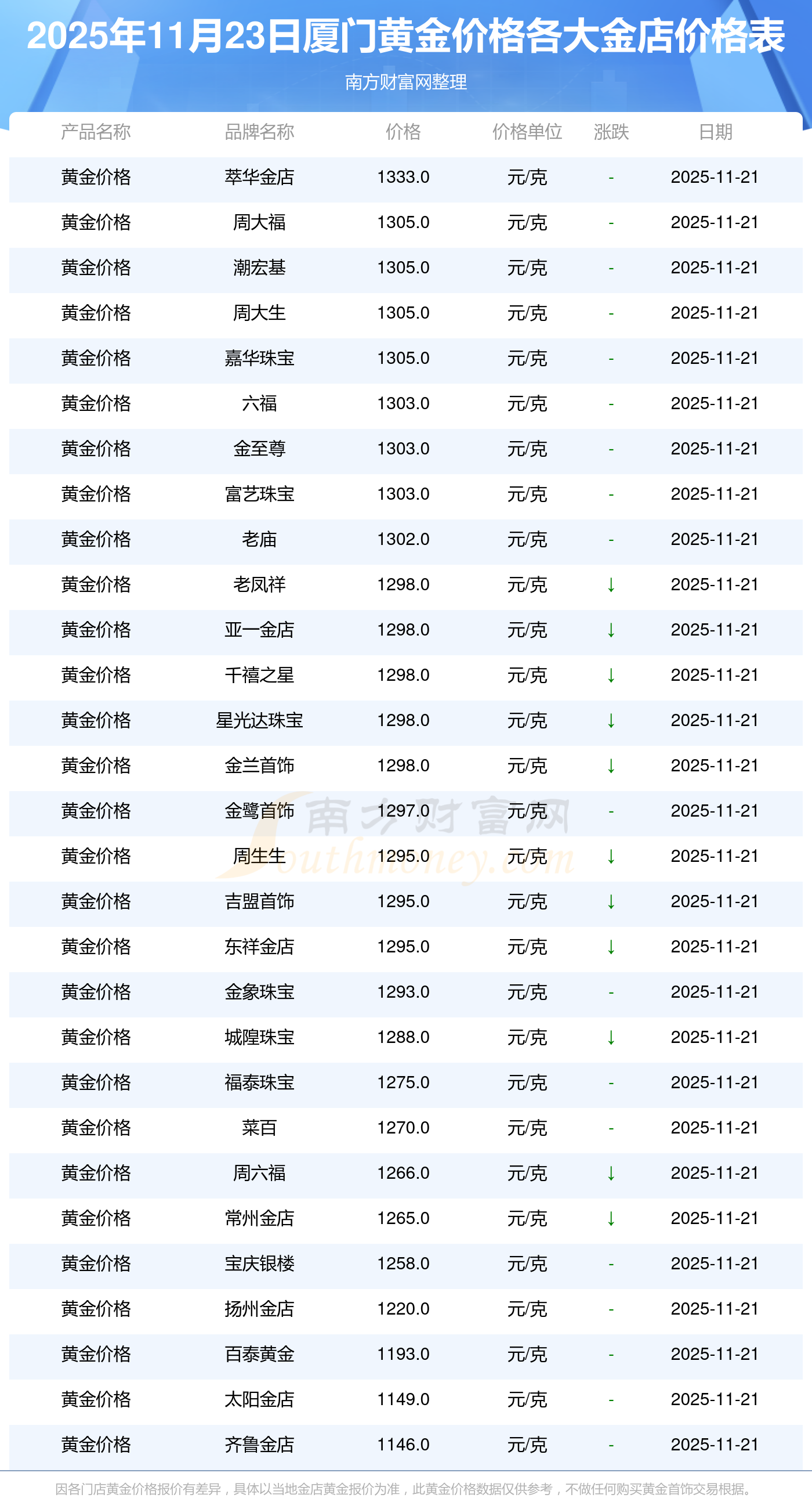 2025年11月23日厦门各大金店黄金价格最新价格:周大福1305.0元/克,周大福616.0元/克,周大福1305.0元/克,周大福45110.0,周大福17570.0,周大福40690.0,周大福1143.0元/克,老凤祥1298.0元/克,老凤祥600.0元/克,老凤祥1298.0元/克,周六福1266.0元/克。
