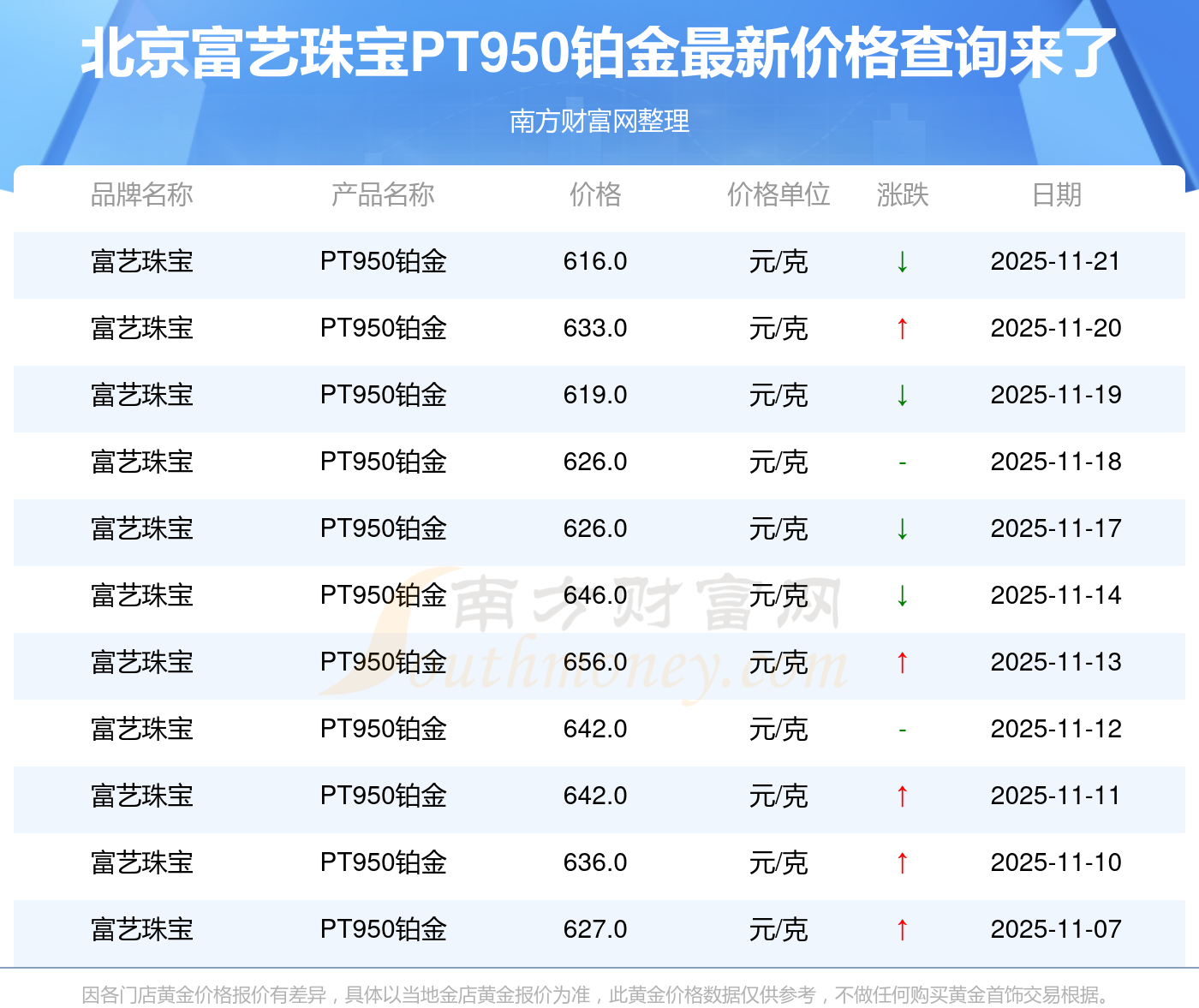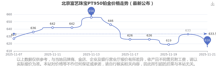 今日北京富艺珠宝PT950铂金价格:616.0元/克。