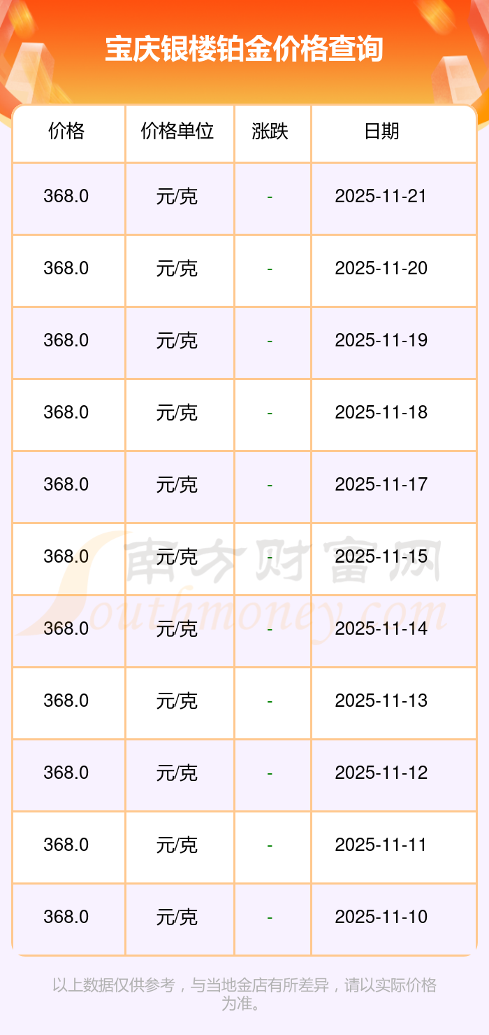 宝庆银楼今日铂金价格的最新市场行情价为368.0元/克。