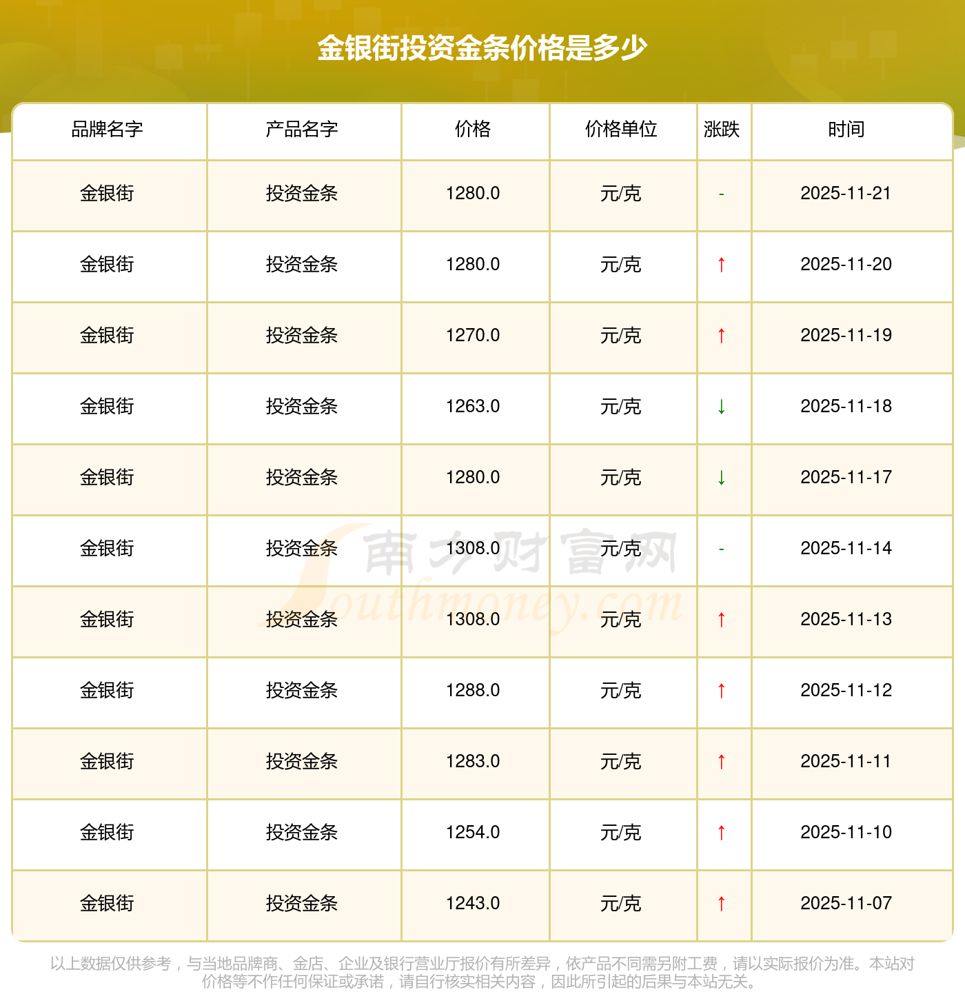 最新数据表明,金银街今日 投资金条价格为1280.0元/克。