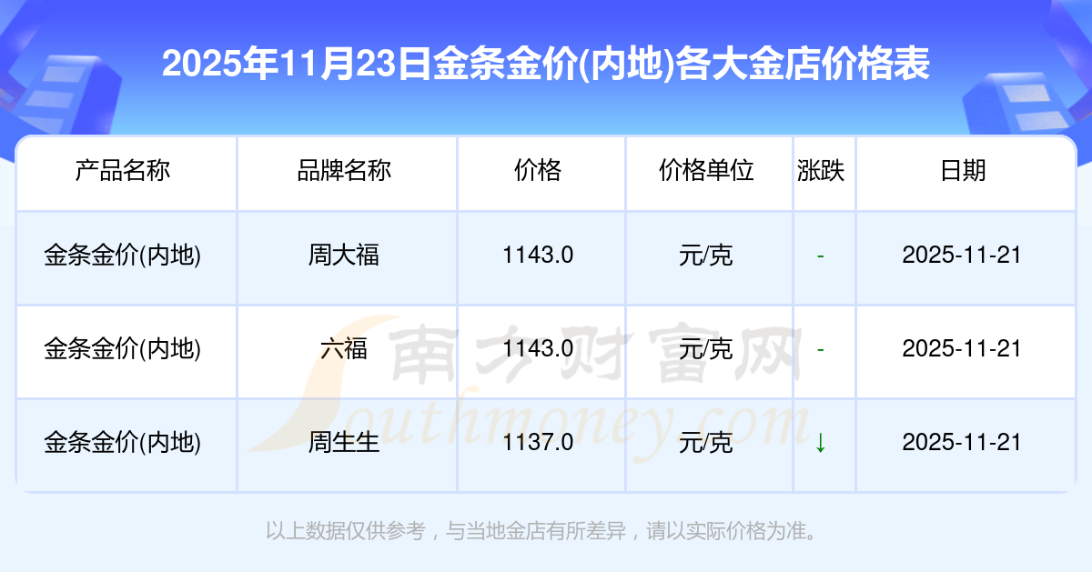 2025年11月23日,周大福、周大福、周大福、周大福、周大福、周大福、周大福、老凤祥、老凤祥、老凤祥、周六福等各大金店品牌金条金价(内地)今日价格如下:周大福1305.0元/克、周大福616.0元/克、周大福1305.0元/克、周大福45110.0、周大福17570.0、周大福40690.0、周大福1143.0元/克、老凤祥1298.0元/克、老凤祥600.0元/克、老凤祥1298.0元/克、周六福1266.0元/克。