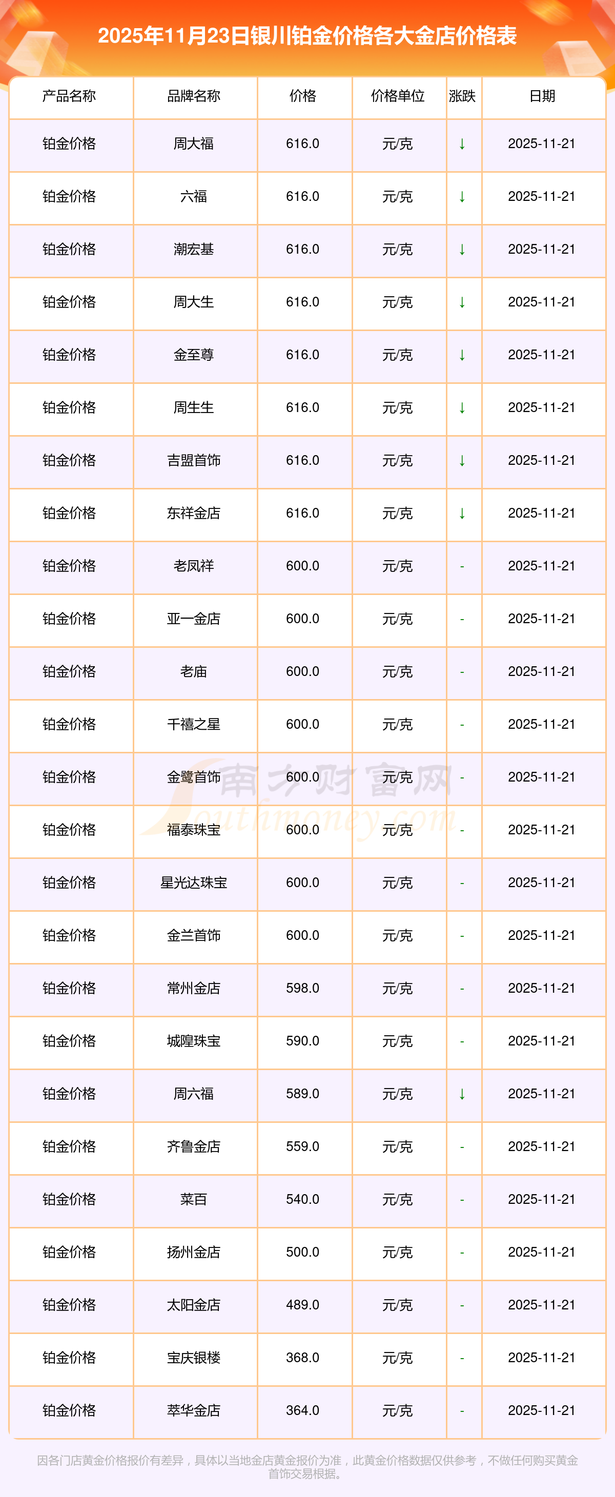 2025年11月23日银川各大金店铂金价格最新价格查询来了:周大福1305.0元/克,周大福616.0元/克,周大福1305.0元/克,周大福45110.0,周大福17570.0,周大福40690.0,周大福1143.0元/克,老凤祥1298.0元/克,老凤祥600.0元/克,老凤祥1298.0元/克,周六福1266.0元/克。