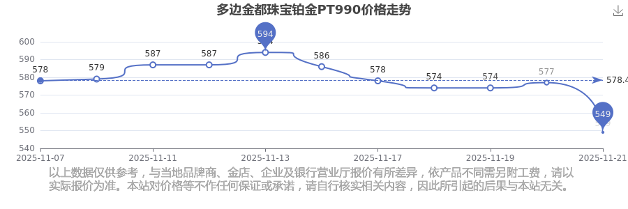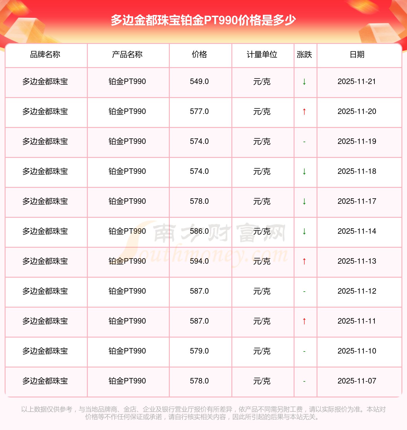 今日多边金都珠宝 铂金PT990价格,最新确定为549.0元/克。