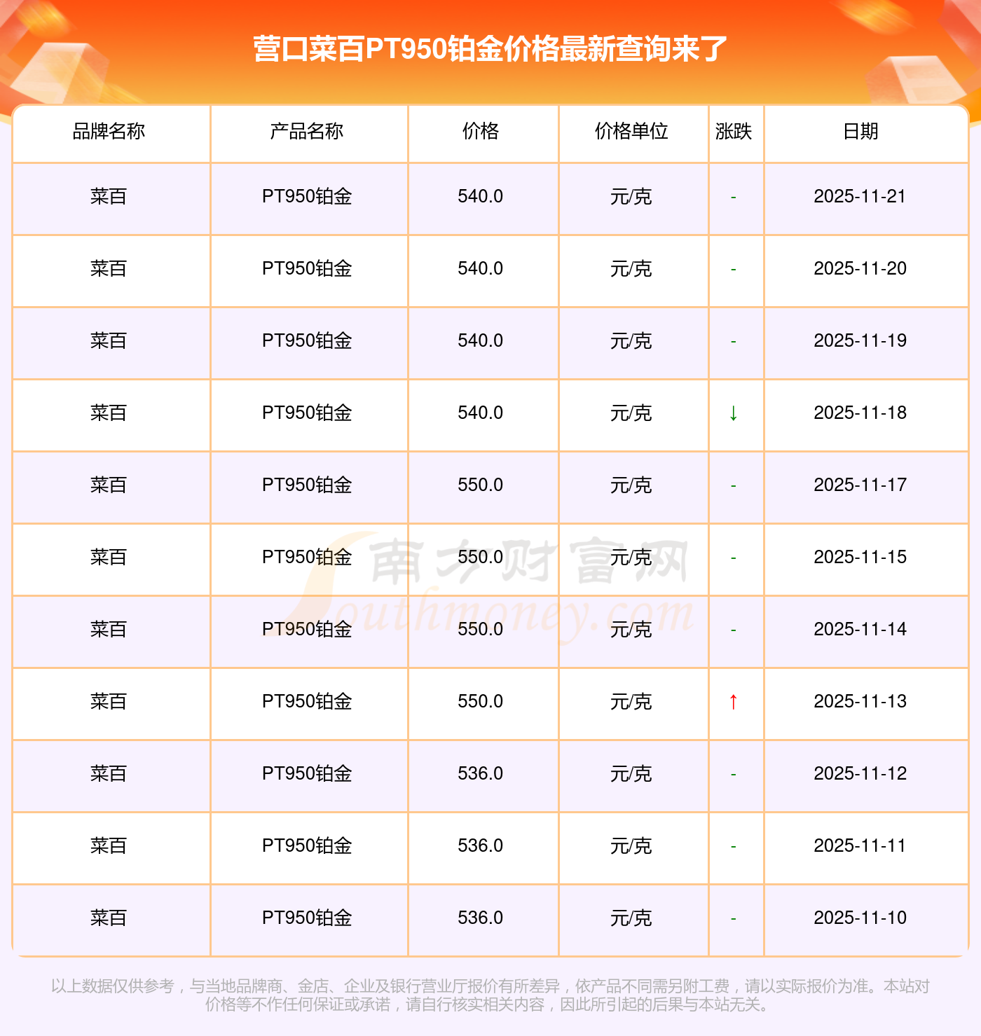 2025年11月23日各大金店PT950铂金最新价格:周大福1305.0元/克,周大福616.0元/克,周大福1305.0元/克,周大福45110.0,周大福17570.0,周大福40690.0,周大福1143.0元/克,老凤祥1298.0元/克,老凤祥600.0元/克,老凤祥1298.0元/克,周六福1266.0元/克。