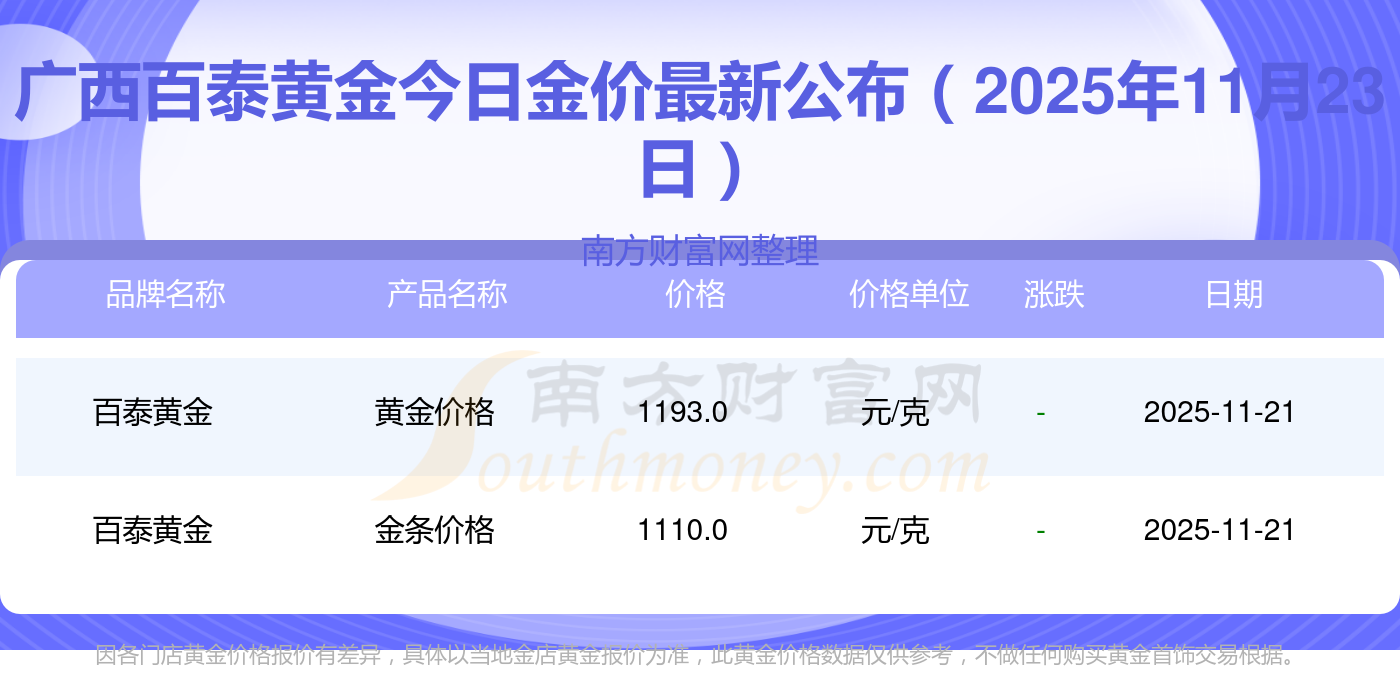 2025年11月23日广西百泰黄金黄金的单价,一克为多少?黄金价格1305.0元/克,铂金价格616.0元/克,饰品金价(内地)1305.0元/克,黄金饰品(香港)45110.0,铂金价格(香港)17570.0,金条价格(香港)40690.0,金条金价(内地)1143.0元/克,黄金价格1298.0元/克,铂金价格600.0元/克,足金价格1298.0元/克,黄金价格1266.0元/克。