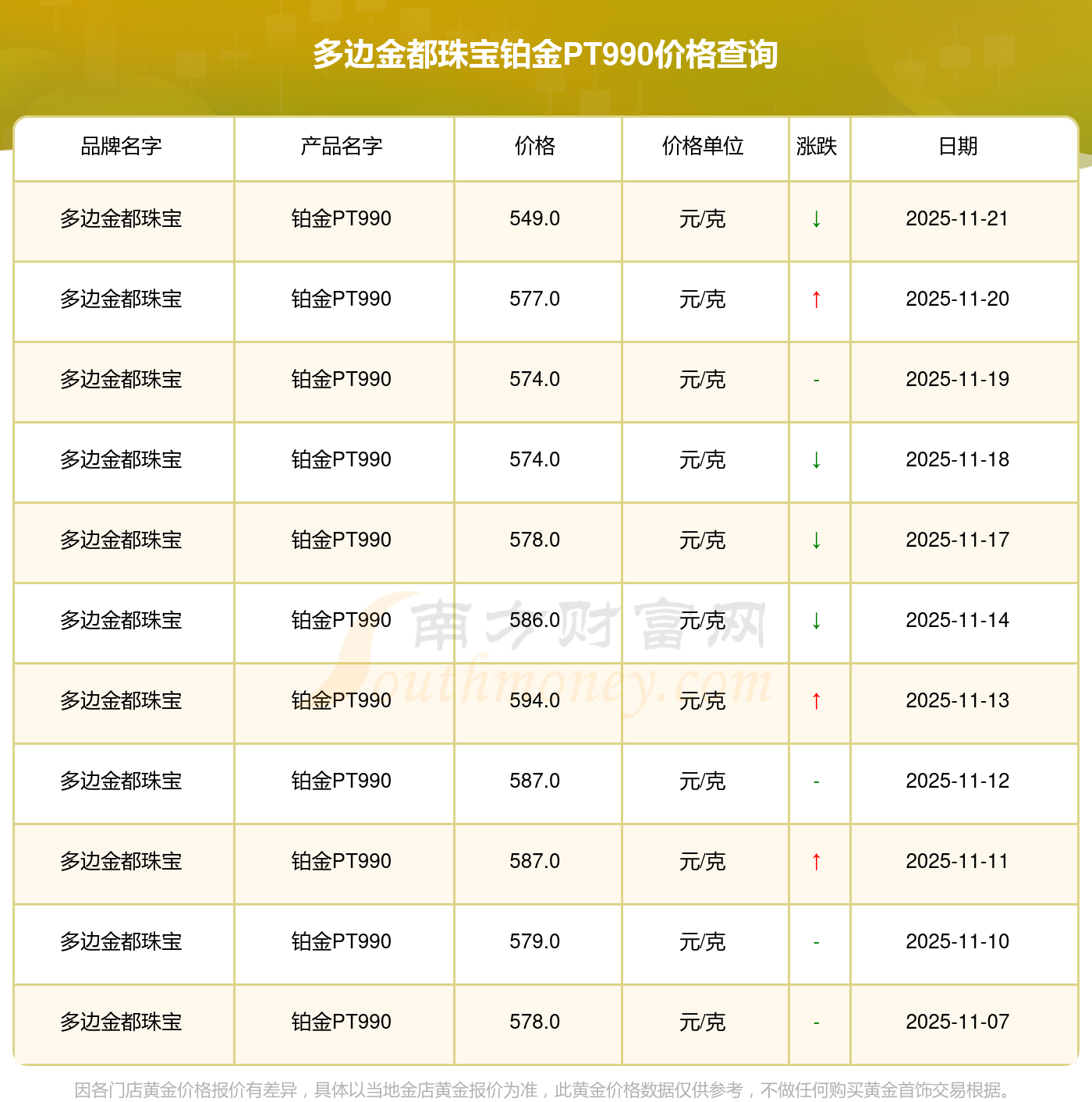 549.0元/克成为多边金都珠宝今日 铂金PT990的最新交易的价格。