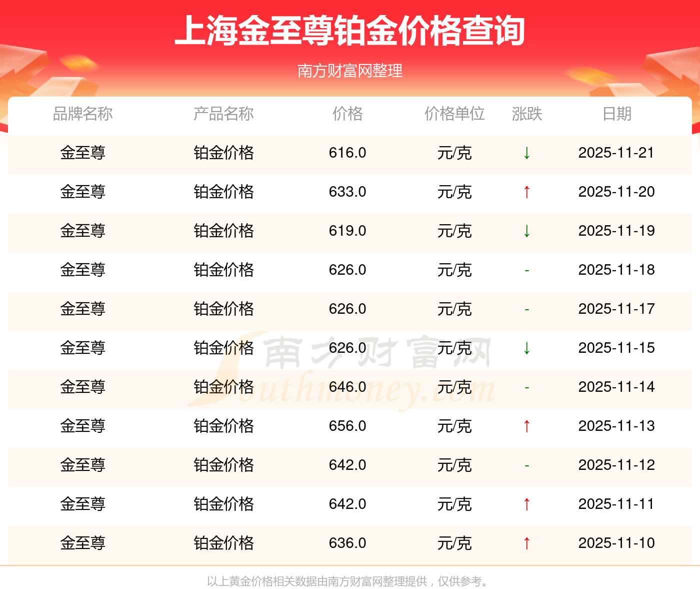 今日(2025年11月23日)上海金至尊铂金价格最新价格为616.0元/克。