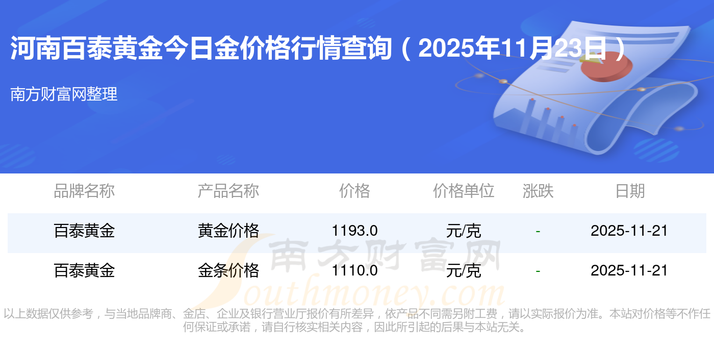 想查询当下黄金价格,今日黄金一克的价格是多少呢?2025年11月23日河南百泰黄金一克黄金对应的价格是多少?黄金价格1305.0元/克,铂金价格616.0元/克,饰品金价(内地)1305.0元/克,黄金饰品(香港)45110.0,铂金价格(香港)17570.0,金条价格(香港)40690.0,金条金价(内地)1143.0元/克,黄金价格1298.0元/克,铂金价格600.0元/克,足金价格1298.0元/克,黄金价格1266.0元/克。