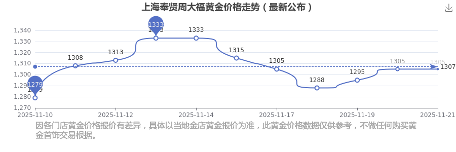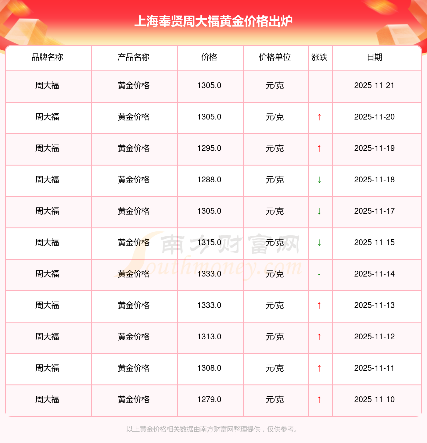 (2025年11月23日)今日上海奉贤周大福黄金价格是1305.0元/克。