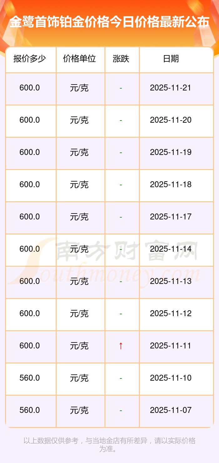 目前金鹭首饰 铂金价格的价格,今日最新为600.0元/克。