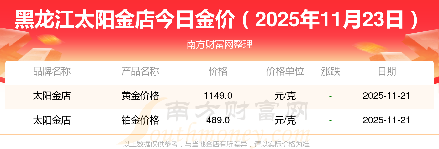 今日黄金价格情况如何?此刻黄金一克要多少钱?2025年11月23日黑龙江太阳金店一克黄金的售价是多少:黄金价格1305.0元/克,铂金价格616.0元/克,饰品金价(内地)1305.0元/克,黄金饰品(香港)45110.0,铂金价格(香港)17570.0,金条价格(香港)40690.0,金条金价(内地)1143.0元/克,黄金价格1298.0元/克,铂金价格600.0元/克,足金价格1298.0元/克,黄金价格1266.0元/克。