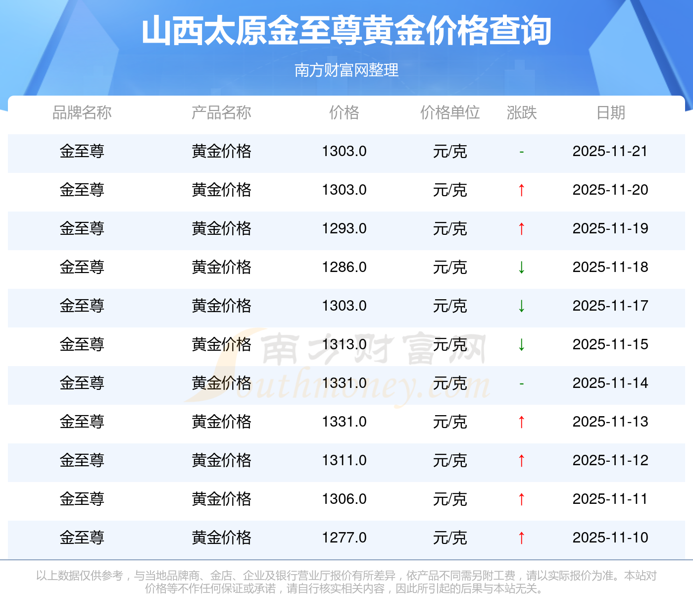 2025年11月23日各大金店黄金价格最新价格:周大福1305.0元/克,周大福616.0元/克,周大福1305.0元/克,周大福45110.0,周大福17570.0,周大福40690.0,周大福1143.0元/克,老凤祥1298.0元/克,老凤祥600.0元/克,老凤祥1298.0元/克,周六福1266.0元/克。