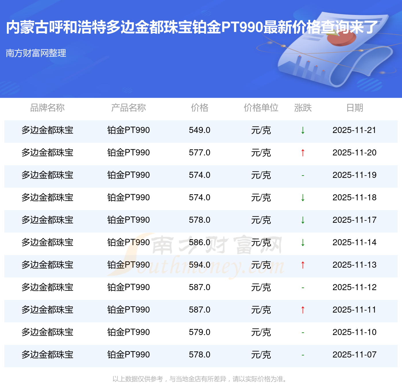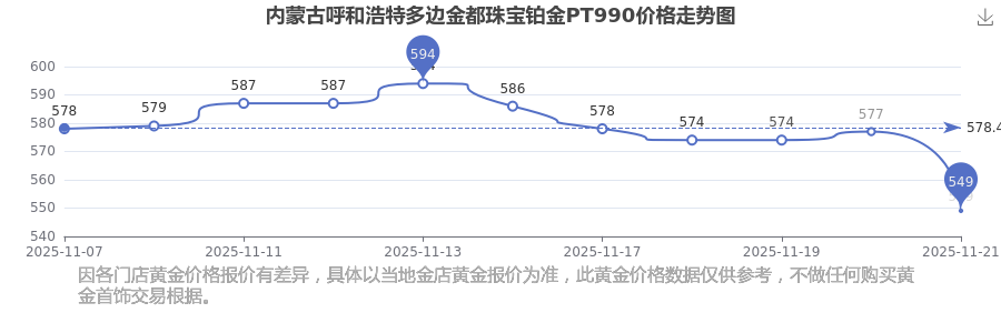 2025年11月23日,内蒙古呼和浩特多边金都珠宝的铂金PT990标价达到 549.0元/克。