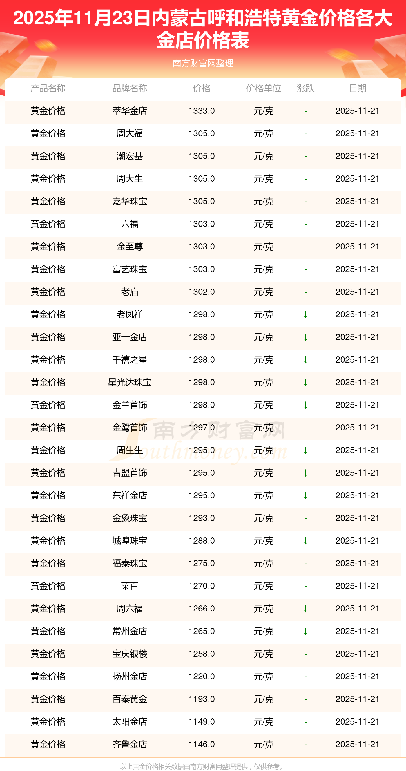 2025年11月23日内蒙古呼和浩特周大福、周大福、周大福、周大福、周大福、周大福、周大福、老凤祥、老凤祥、老凤祥、周六福等各大金店品牌黄金价格最新价格如下:周大福黄金价格1305.0元/克,周大福铂金价格616.0元/克,周大福饰品金价(内地)1305.0元/克,周大福黄金饰品(香港)45110.0,周大福铂金价格(香港)17570.0,周大福金条价格(香港)40690.0,周大福金条金价(内地)1143.0元/克,老凤祥黄金价格1298.0元/克,老凤祥铂金价格600.0元/克,老凤祥足金价格1298.0元/克,周六福黄金价格1266.0元/克。