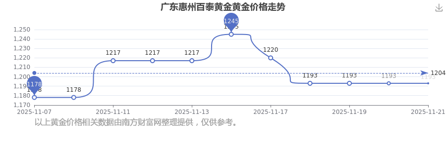 今日广东惠州百泰黄金黄金价格公布黄金价格今天多少一克今日(2025年11月23日),广东惠州百泰黄金黄金价格的定价为 1193.0元/克。