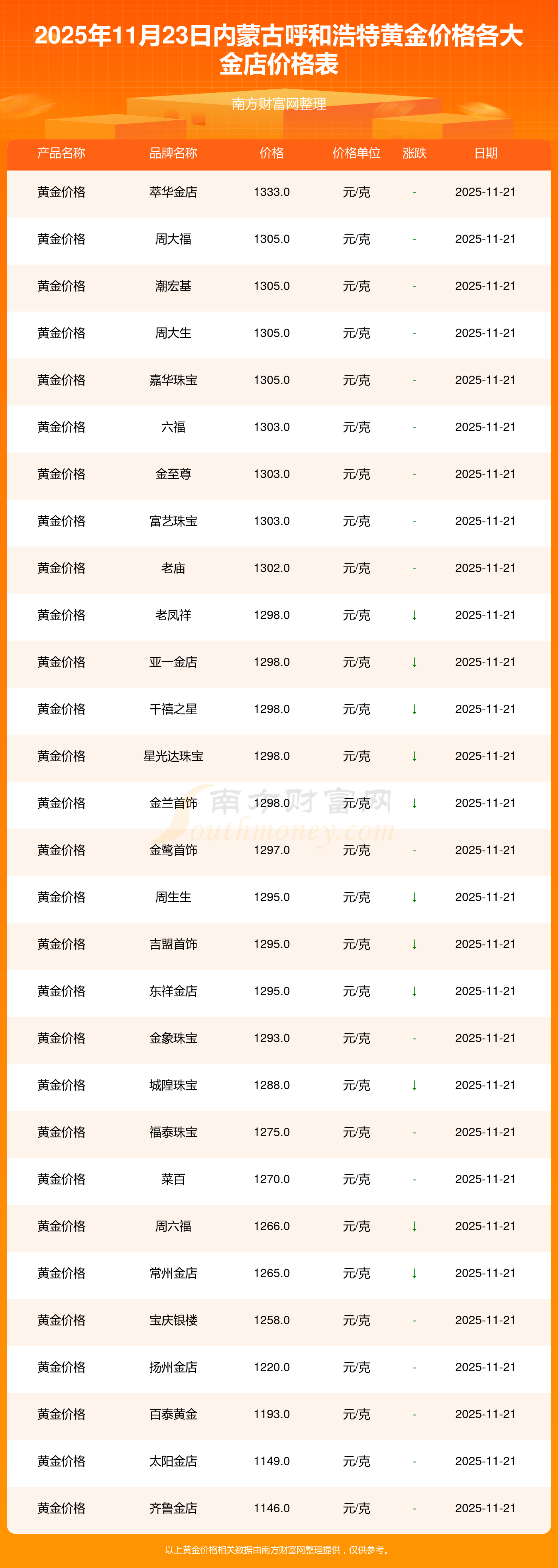 以上数据仅供参考,与当地品牌商、金店、企业及银行营业厅报价有所差异,依产品不同需另附工费,请以实际报价为准。本站对价格等不作任何保证或承诺,请自行核实相关内容,因此所引起的后果与本站无关。