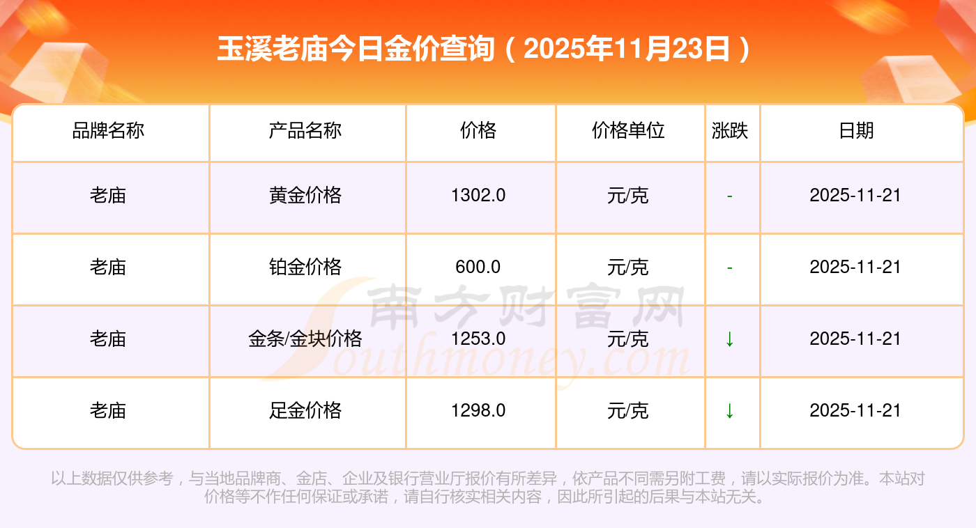 2025年11月23日玉溪老庙今日价格:黄金价格1305.0元/克,铂金价格616.0元/克,饰品金价(内地)1305.0元/克,黄金饰品(香港)45110.0,铂金价格(香港)17570.0,金条价格(香港)40690.0,金条金价(内地)1143.0元/克,黄金价格1298.0元/克,铂金价格600.0元/克,足金价格1298.0元/克,黄金价格1266.0元/克。