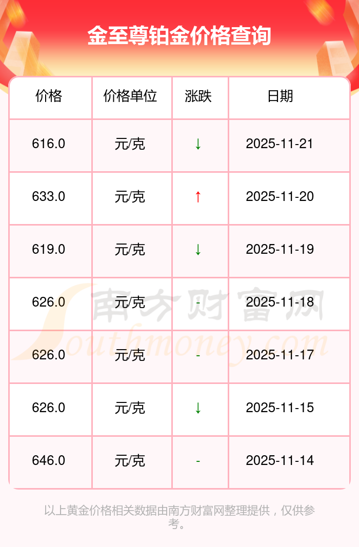 今日(2025年11月23日),金至尊铂金价格最新价格为616.0元/克。