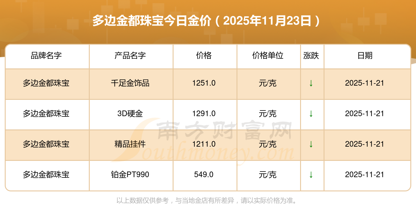 现在多边金都珠宝黄金价格是多少钱1克_2025年多边金都珠宝今日金价是多少钱一克,最新多边金都珠宝查询,2025年11月23日多边金都珠宝千足金饰品现在每克多少钱?最新多边金都珠宝千足金饰品报价公布,一起来看看吧!