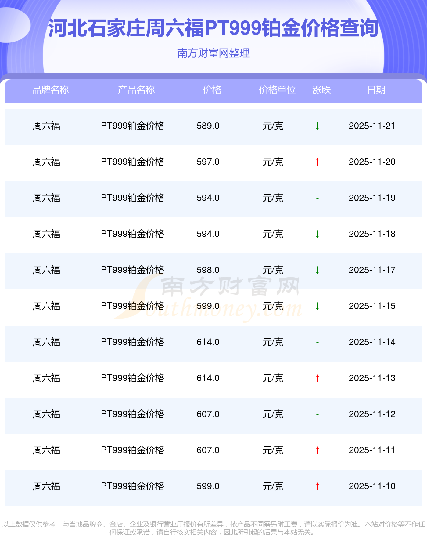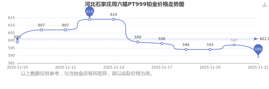 河北石家庄周六福在 2025年11月23日的PT999铂金价格零售价格为 589.0元/克。