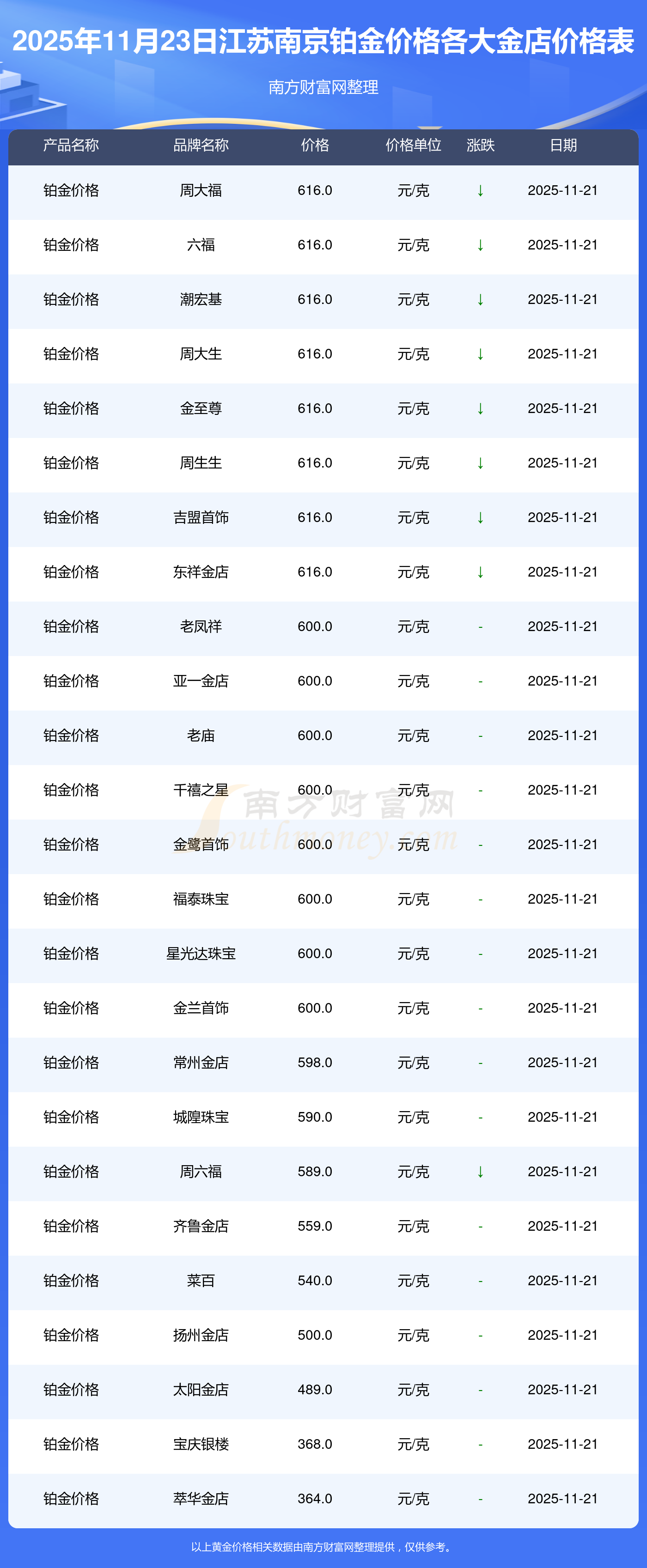 今天是2025年11月23日,江苏南京周大福、周大福、周大福、周大福、周大福、周大福、周大福、老凤祥、老凤祥、老凤祥、周六福等各大金店品牌铂金价格最新价格行情是这样的:周大福1305.0元/克、周大福616.0元/克、周大福1305.0元/克、周大福45110.0、周大福17570.0、周大福40690.0、周大福1143.0元/克、老凤祥1298.0元/克、老凤祥600.0元/克、老凤祥1298.0元/克、周六福1266.0元/克。