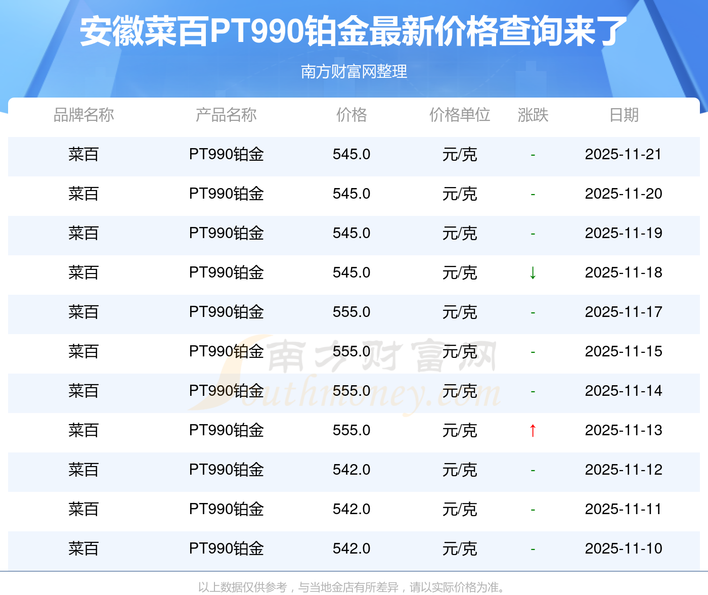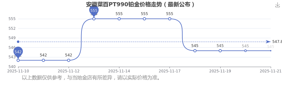 安徽菜百在 2025年11月23日,PT990铂金的售卖价格是 545.0元/克。