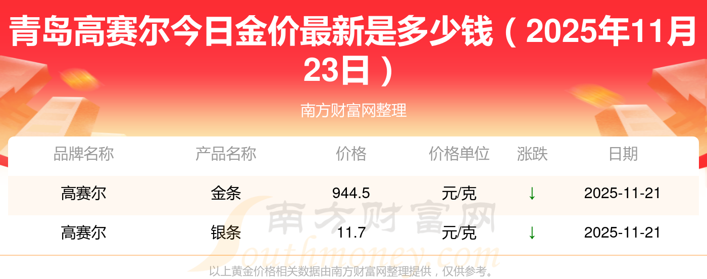 2025年11月23日青岛高赛尔每克黄金的市场价格是多少:黄金价格1305.0元/克,铂金价格616.0元/克,饰品金价(内地)1305.0元/克,黄金饰品(香港)45110.0,铂金价格(香港)17570.0,金条价格(香港)40690.0,金条金价(内地)1143.0元/克,黄金价格1298.0元/克,铂金价格600.0元/克,足金价格1298.0元/克,黄金价格1266.0元/克。
