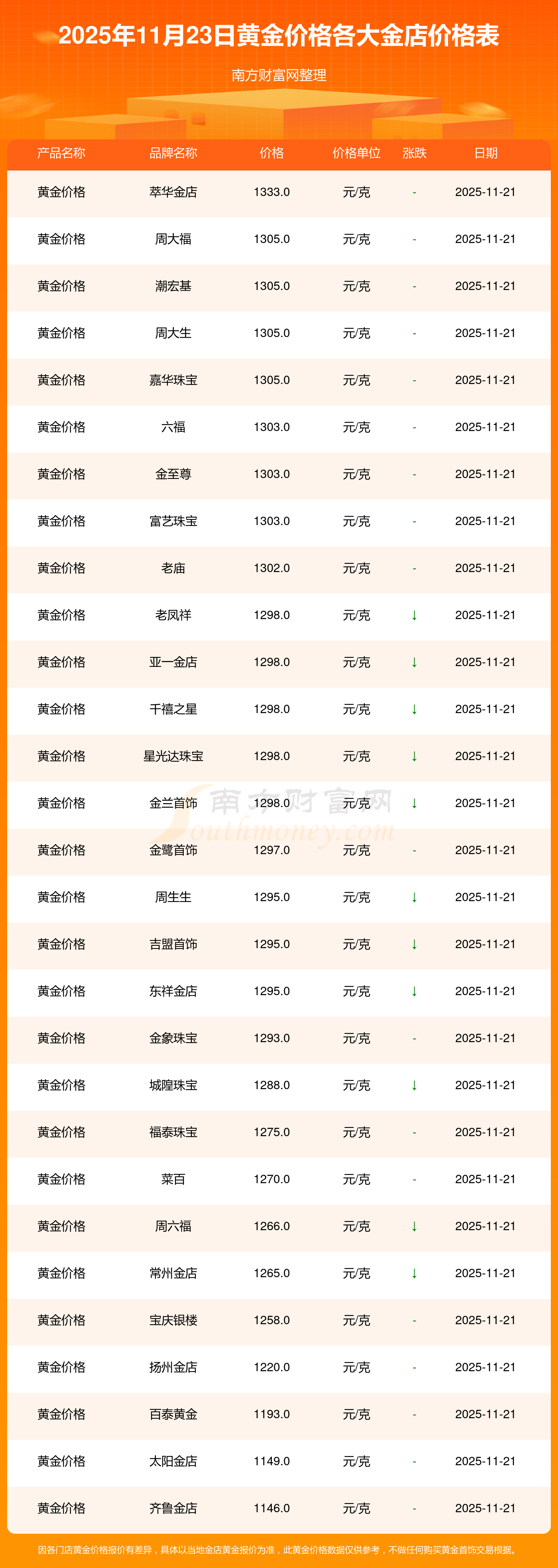 2025年11月23日周大福、周大福、周大福、周大福、周大福、周大福、周大福、老凤祥、老凤祥、老凤祥、周六福等各大金店品牌黄金价格最新价格如下:周大福黄金价格1305.0元/克,周大福铂金价格616.0元/克,周大福饰品金价(内地)1305.0元/克,周大福黄金饰品(香港)45110.0,周大福铂金价格(香港)17570.0,周大福金条价格(香港)40690.0,周大福金条金价(内地)1143.0元/克,老凤祥黄金价格1298.0元/克,老凤祥铂金价格600.0元/克,老凤祥足金价格1298.0元/克,周六福黄金价格1266.0元/克。