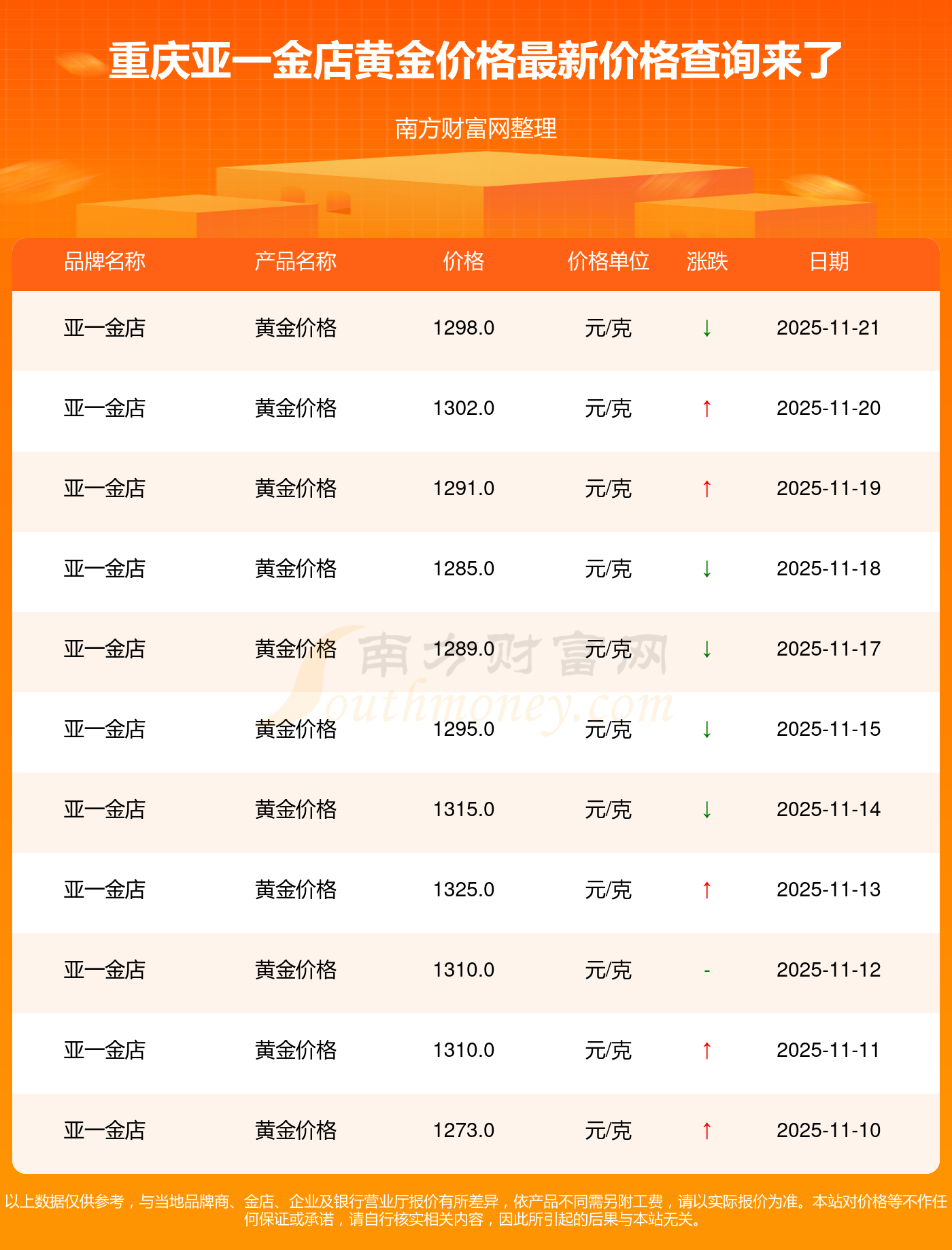 以上数据仅供参考,与当地品牌商、金店、企业及银行营业厅报价有所差异,依产品不同需另附工费,请以实际报价为准。本站对价格等不作任何保证或承诺,请自行核实相关内容,因此所引起的后果与本站无关。